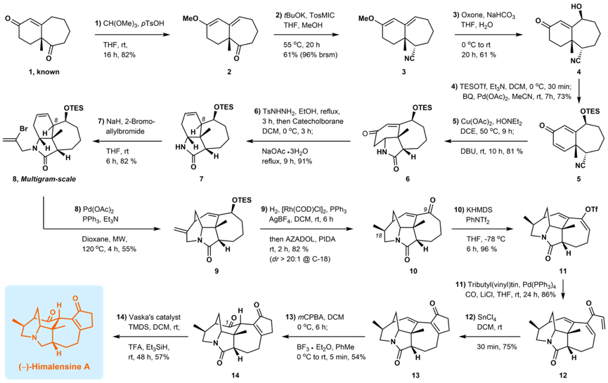 Himalensine A是中国科学院上海药物研究所岳建民院士课题组于2016年从喜马拉雅地区的虎皮楠科植物Daphniphyllum himalense中分离得到的一种calyciphylline A类型的虎皮楠生物碱。Himalensine A有着较为独特的2-氮杂双环[3.3.1]壬烷结构,还含有六个手性中心和一个季碳中心,因此具有很大的合成挑战性。2017年,牛津大学学者曾成功地以22步路线首次完成了Himalensine A的不对称全合成工作。