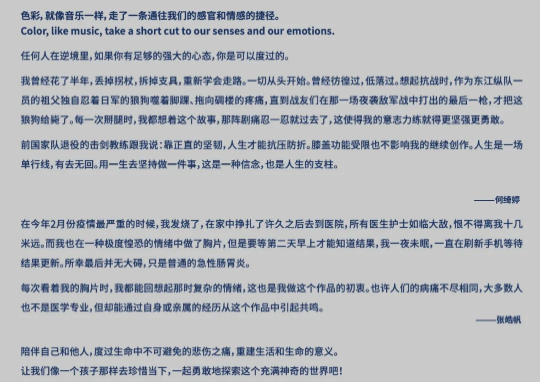 何绮婷在第一次使用自己受伤的左膝X光片创作蓝晒时,发现原来自己患处的X光片也可以制作成如此绚丽的作品,这为此次创作人体蓝晒作品埋下了伏笔。而张皓帆在今年二月份因发烧到医院拍胸片的经历,