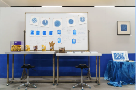 将实验室中的仪器布置在现场,复原蓝晒创作时的场景。让观者能够近距离地感受蓝晒制作的氛围。同时,张皓帆在白板上通过几个例子,简洁清楚地向观者呈现了在实验室中,探索作品的曝光时长和负片制作的曲线调整的过程,让观者能够更明了蓝晒创 作过程中的技术难点。