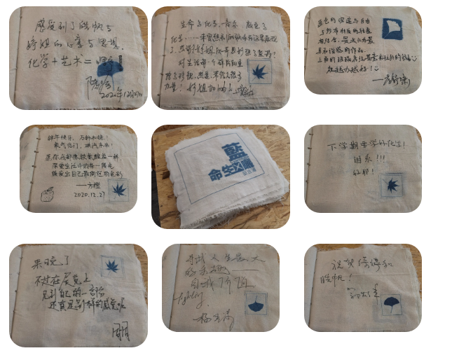 何绮婷使用麻布手工制作了一本留言簿,供观展者留下有趣的感言,与作者互动交流,得知大家对化学的浓厚兴趣,坚定我们做蓝晒推广和科普的信念。