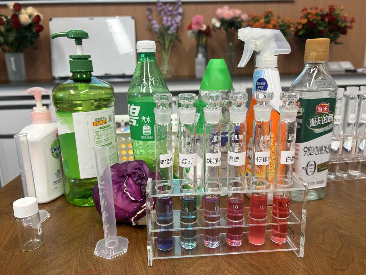 活动首先由房芳老师讲解内容,并演示相关实验,从生活中常见的日用品开始,深入浅出地引导孩子们理解酸碱化合物的涵义;再从英国著名化学家波义耳发现石蕊试液的故事引出酸碱指示剂的定义,并期许孩子们要仔细观察事物,不断提出问题,探索问题。活动中孩子们亲自体验了石蕊试液和紫甘蓝浸出液遇小苏打溶液、纯净水和白醋变色的过程。在最后的鲜花研制过程中,孩子们通过自己动手研磨鲜花提取到了红玫瑰或紫罗兰的浸出液,考察了其分别与酸碱化合物相遇后的变色情况,加深了对酸碱指示剂定义的理解。