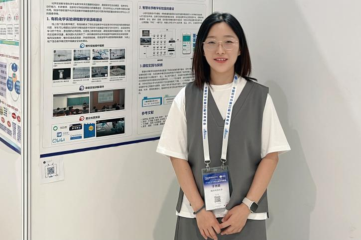 于月娜老师于19日上午参加了高等教育分会场的墙报交流活动,通过主题为“信息技术赋能的有机化学实验教学探索与实践”的墙报与同行专家分享了有机实验教学团队在实验教学数字化方面开展的工作,团队努力构建以学生为中心的共享、自主、多元、开放的学习空间,进而助力教学模式和评价方式的改革与创新。墙报获评“中国化学会化学教育学科委员会优秀墙报奖”。